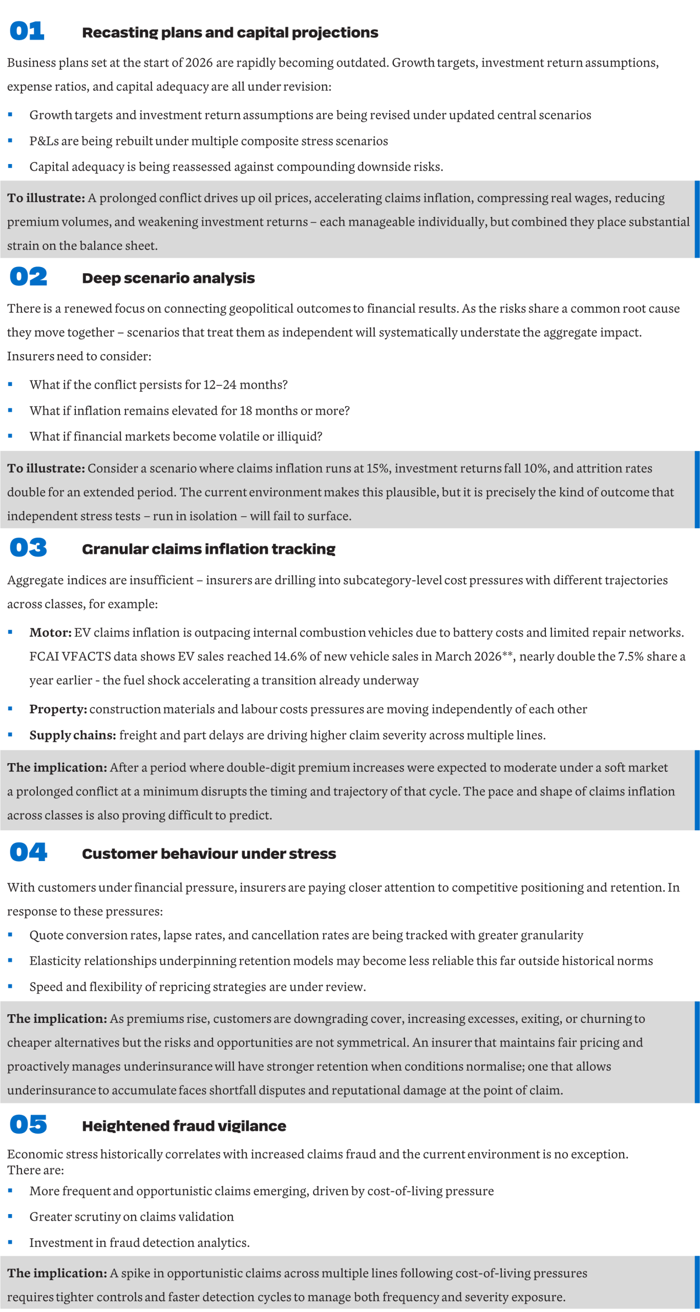 Structural shocks that generate correlated, simultaneous pressure across claims, assets, and demand are not a one-off feature of 2026 – they are an increasingly consistent feature of the risk environment. This time it was Hormuz and energy, next time it could be another regional conflict disrupting technology supply chains, a major climate event tightening reinsurance capacity, or something else entirely. The challenge is not predicting the next crisis, it is building the infrastructure and processes to respond rapidly when the next trigger arrives. These include scenario frameworks that can be reoriented quickly, assumptions built to be updated rather than anchored to history, and capital and portfolio positions that are monitored against a range of outcomes. Insurers who invest in this capability now will be better placed to navigate whatever comes next.