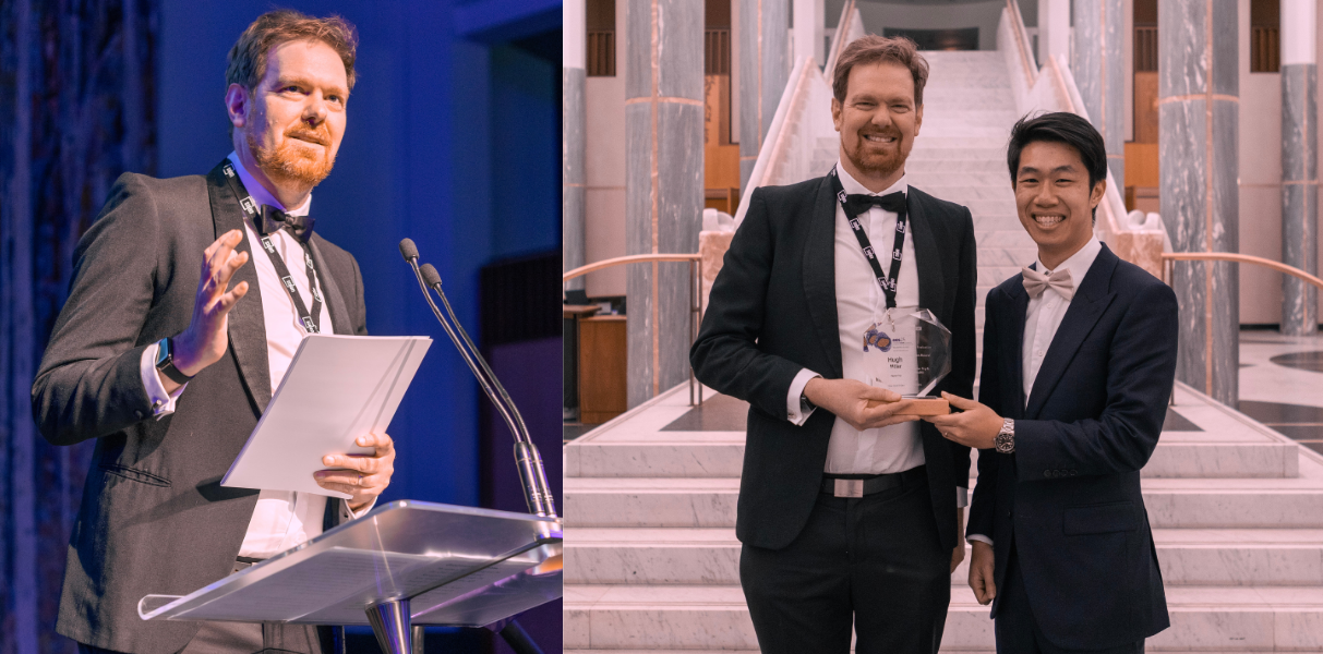 Hugh Miller accepting the award at the AES event and after the win, with Dennis Lam